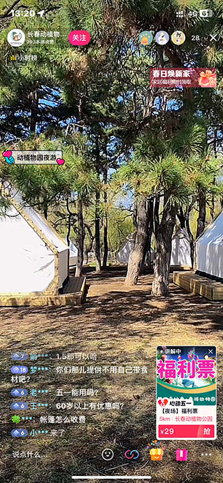 長(zhǎng)春市動(dòng)植物公園開(kāi)通了企業(yè)藍(lán)V,在直播中添加團(tuán)購(gòu)套餐。可以看見(jiàn)整場(chǎng)直播中,賬號(hào)的熱度會(huì)隨著粉絲在直播間互動(dòng)評(píng)論而提升。